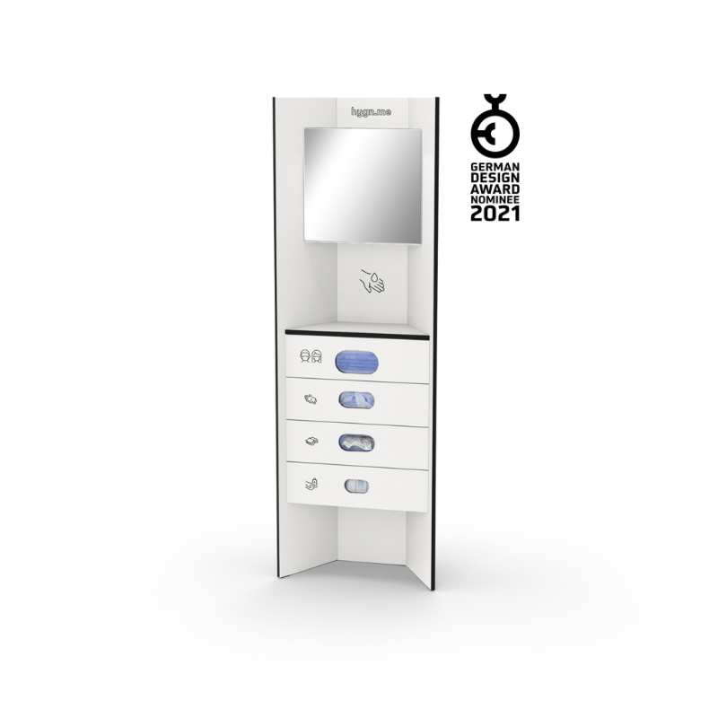 Das Top-Modul Dispenser lässt sich einfach auf das Bottom-Modul aufstecken. Es besteht stets aus Spiegel und einem dahinter versteckten Kontaktlos-Dispenser für die Händedesinfektion. Die Basis (Bottom-Modul) enthält vier steckbare Einsätze zur Entnahme von Hygieneartikeln.