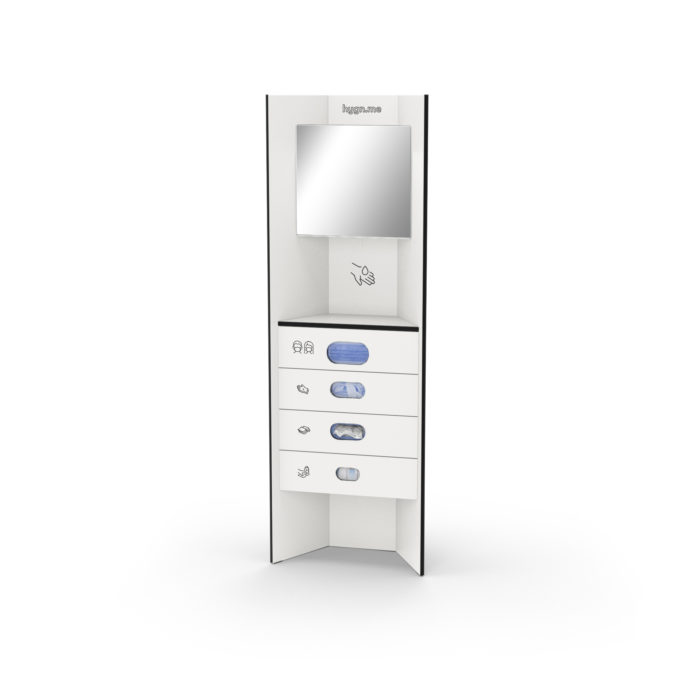 Die Station 1 premium ist ein stehende modulare Hygienestation mit kontaktloser Handdesinfektion, vier Fächern für Hygieneprodukte und einem Spiegel. Sie bietet vollumfängliche Hygiene und Infektionsschutz. Die Station 1 ist die ideale Lösung für Orte an denen viele Menschen zusammenkommen und Hygiene unverzichtbar ist.
